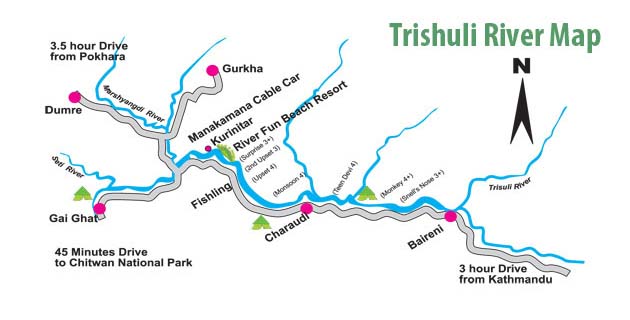 | Day 1 | Charaudi to Kurinighat: Soon after breakfast, at about 7.30 am the bus leaves Kathmandu heading for Charaudi, the put-in point. After a 2 ½ hour drive, Charaudi is reached where a crowd of friendly local people eagerly wait to watch the proceedings. The sight of foreigners all geared up for rafting fascinates them. The crew prepares the rafts, after which all head towards the river for Safety Talk and lessons on how to use paddles. On the first day a number of Class I to Class III rapids are encountered. Ratings are all given on the international rating scale. Two hours down the river is a beach with strange shaped boulders that resemble sculptures and this is the lunch spot. Outdoor lunch by the river is always an enchanting experience. It also gives everyone a break from paddling and time to take in the scenery Paddling down after lunch, a large gorge is encountered, the Trishuli gorge, which is narrow and the walls very steep causing the river to accelerate through it. Naturally the rapids here are more ferocious and also more frequent. This is an exciting section and time to hold on tight. We finally come across a rapid named after a very old suspension bridge, Jhoolunge Pul. Looking up one can see a crowd of locals chattering with excitement as they watch the adventurous foreigners tackle the river on rubber boats. One thing to watch for along the riverside, are the geological formations that look intriguing. At the end of the day, it is time to stop and set up camp at Kuringhat, which is a very popular expatriates and locals as well. The crew gets busy pitching up tents and everyone is welcome to help in whatever chores need to get done. A feeling of togetherness is encouraged which adds a lot to the enjoyment of the trip. Dinner is prepared under gas fires and it is also the time to come together and share experiences. Camping out under the brilliant stars on the riverside with the roar of the river as a backdrop is an amazing experience. Campsite dinners can be quite entertaining when people share their personal tales. We do have our own Resort in Kurinighat called River Fun Beach Resort, where we will serve all meal and accommodation. |